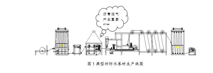 通過現(xiàn)場勘察和設(shè)計(jì)經(jīng)驗(yàn),現(xiàn)場煙氣及粉塵的來源主要有兩個部分,一是原料儲存及攪拌罐頂部排氣孔的無組織排放,二是防水卷材的浸涂、覆膜、撒砂、包裝工藝環(huán)節(jié)產(chǎn)生的高溫瀝青煙氣。